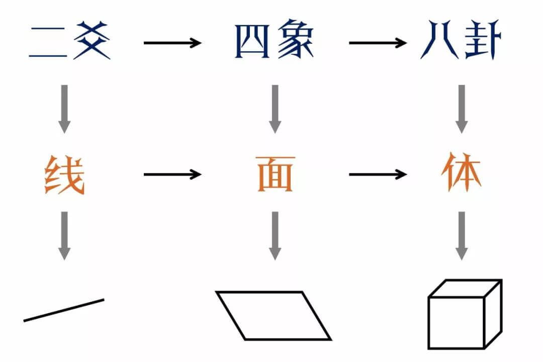 在上一节里,我们把“二爻”比作一条线,“四象”比作一个面,“八卦”比作一个立体。