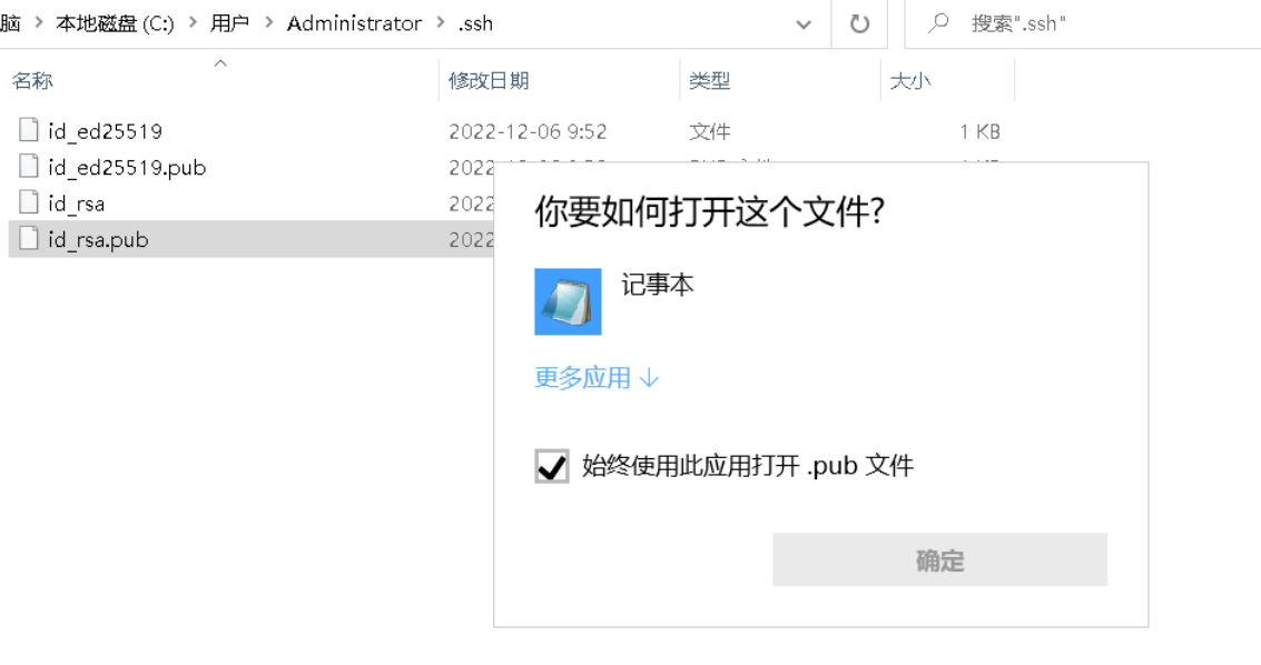 用记事本打开 C:\Users\Administrator\.ssh\id_rsa.pub,复制里面 ssh-rsa AAAAXXXXXXXX 开头的所有内容。