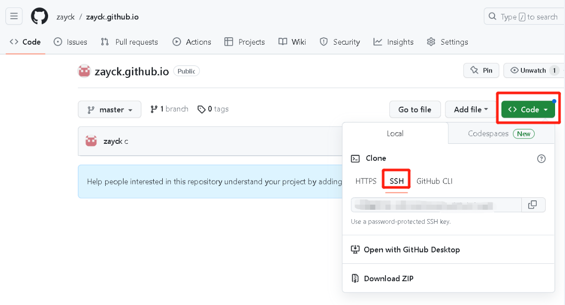 返回仓库,依次点击 <> Code — SSH,复制下方的内容 git@github.com:XXXXX.git。回到根目录的 _config.yml,找到 deploy,增添下面的 3 行。