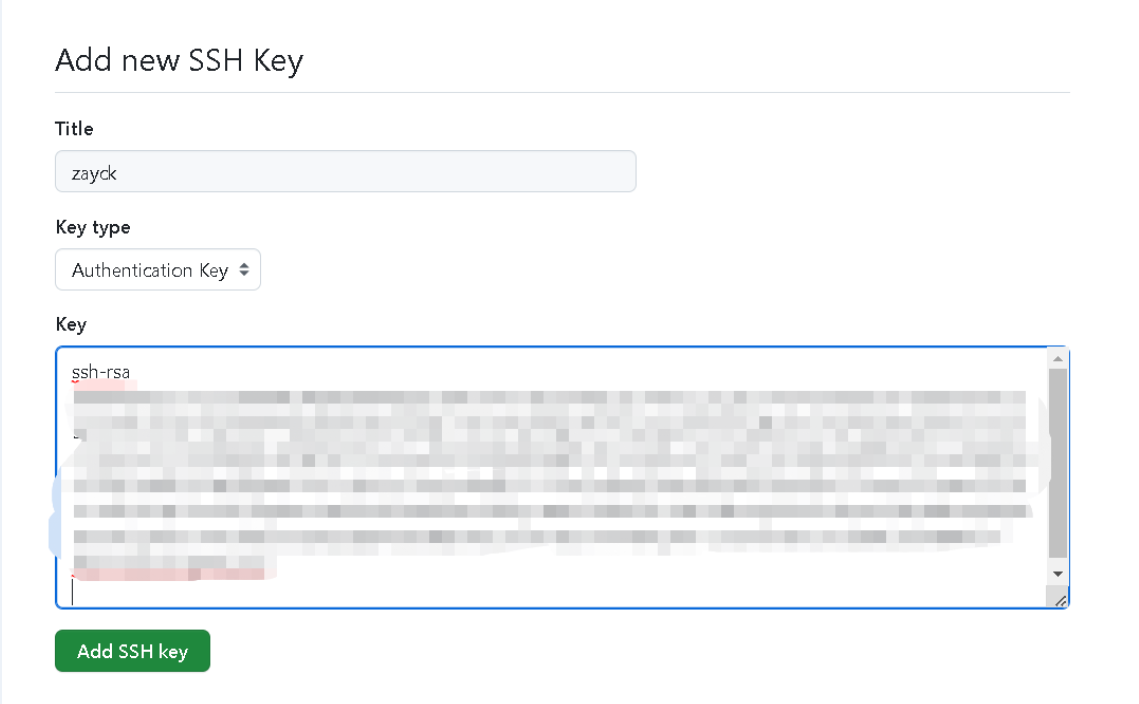 Title 随便写,将刚刚复制的 ssh-rsa AAAAXXXXXXXX 粘贴到 key 下面,点击 Add SSH key。